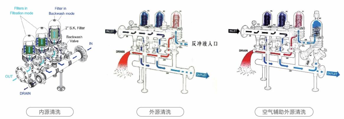 反洗模式1.內源清洗:利用過濾液的自身壓力反沖, 要求過濾出水壓力大于2.8公斤。
