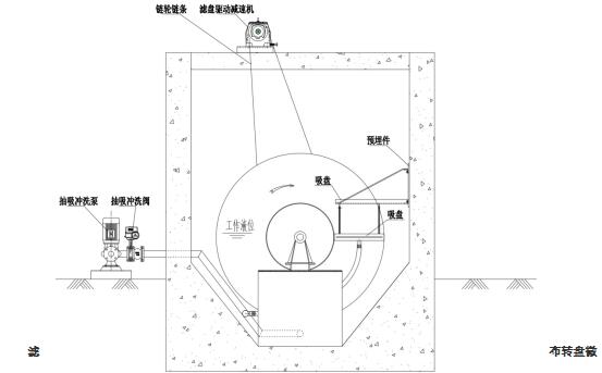 3、濾盤抽吸反洗機構(gòu) :由反洗吸盤、管道、反洗吸盤支架部件等組成。用于濾布的抽吸清洗。