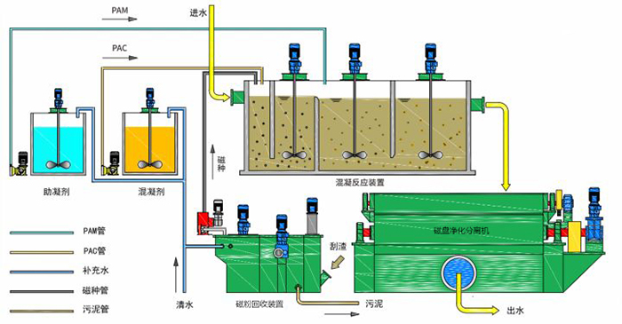 工藝流程簡述 (1)污水泵從取水點抽水進入混凝反應器,與一定濃度磁性物質(zhì)混合均勻;