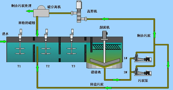 系統在混合池中投加絮凝劑、磁種和助凝劑進行磁混凝反應;進入澄清池進行高效的固液分離;澄清池中的污泥通過磁種提升泵泵入到高剪機及磁分離器,將磁種從污泥中分離出來,返回到混合池繼續參與反應;剩磁余污泥通過污泥排放系統,排至污泥處理系統進一步處理。